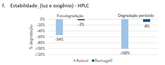 Revinage® mostrou-se bastante superior ao retinol nas duas condições, sendo muito mais estável à exposição à luz e a agentes oxidantes.